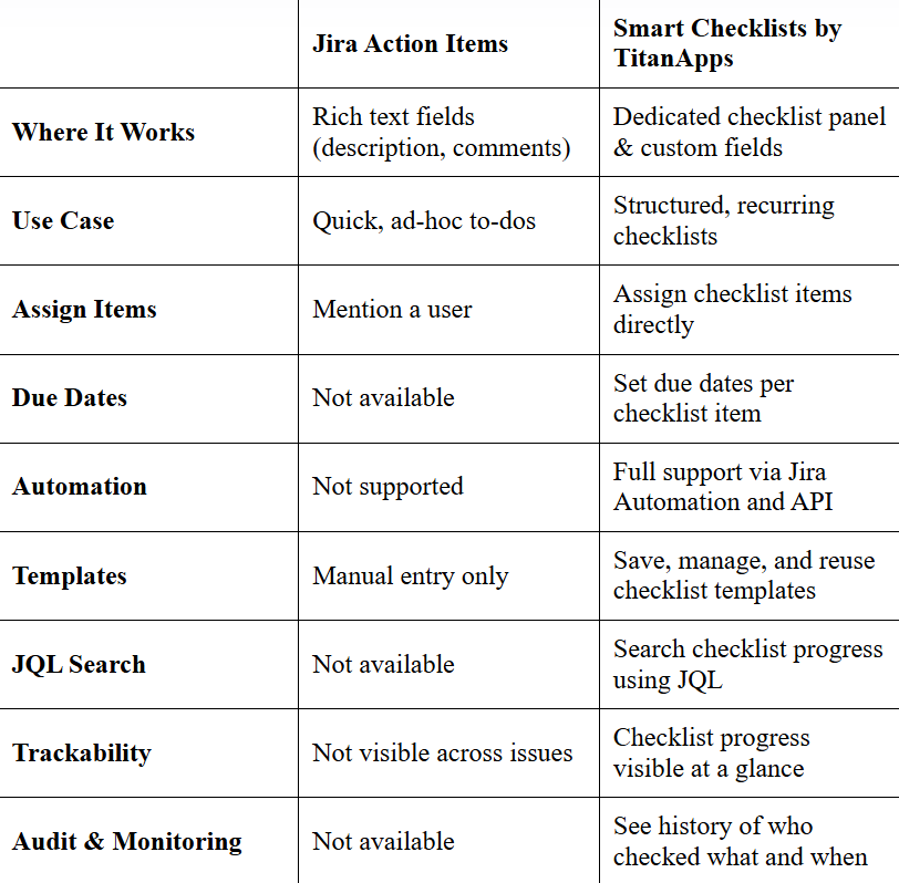 While Jira Action Items offer a lightweight way to manage quick tasks, Smart Checklists by TitanApps provide the structure, automation, and visibility needed for larger Agile workflows.