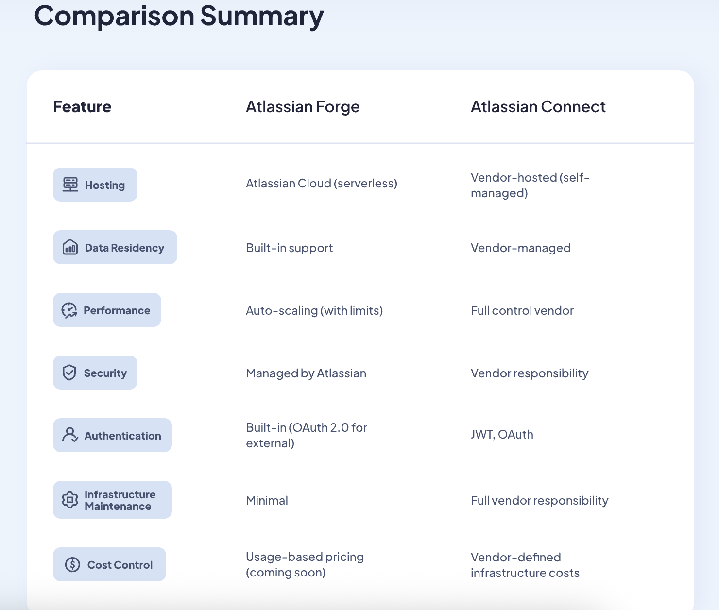 Forge eliminates the operational burden of hosting and security compliance, allowing developers to focus on building functionality. It also aligns with Atlassian’s long-term cloud strategy, meaning Forge apps are future-proof as the Atlassian ecosystem continues evolving.