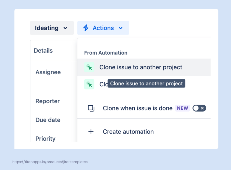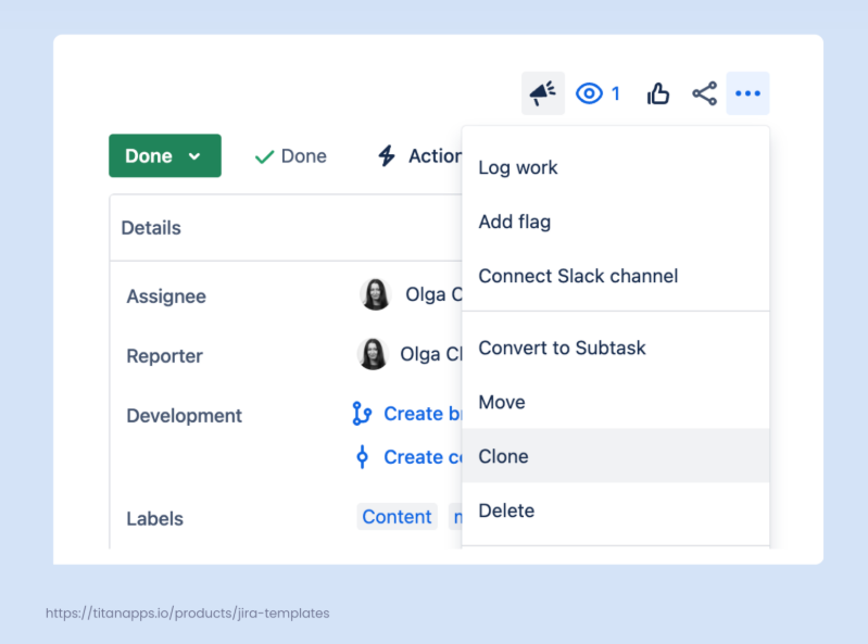 - Time optimization – instead of filling in issue details manually, you can re-use the structure from a similar issue. With recurring tasks, cloning significantly boosts efficiency.
