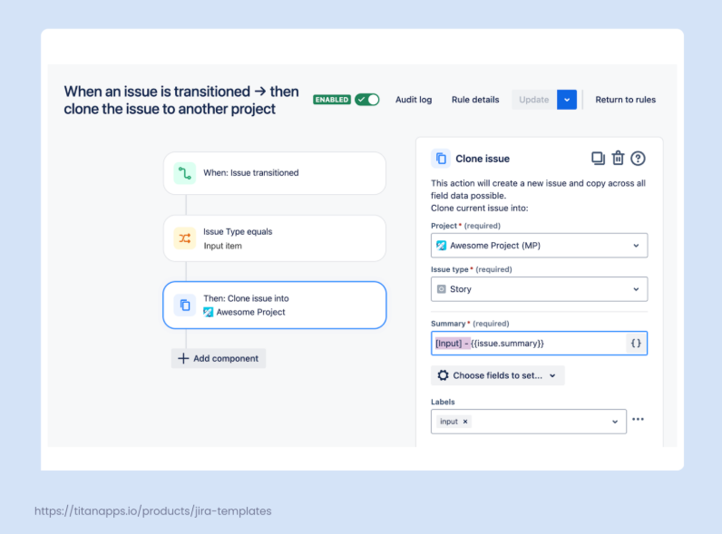 - Linking issues automatically – related or similar issues are linked automatically with the Clones/Cloned by link type. This helps you keep your work in Jira organized.
